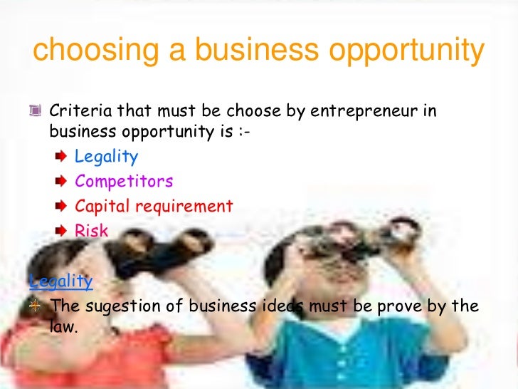 27. 27. choosing a business opportunity Criteria that must be choose by entrepreneur in business opportunity is :- Legality Competitors Capital requirement RiskLegality The sugestion of business ideas must be prove by the law.