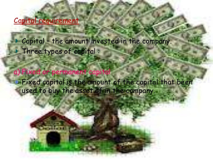 29. 29. Capital requirement Capital – the amount invested in the company. Three types of capital :a) Fixed or permanent capital Fixed capital is the amount of the capital that been used to buy the asset of in the company.