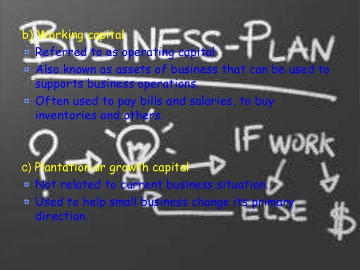 30. 30. b) Working capital Referred to as operating capital Also known as assets of business that can be used to supports business operations. Often used to pay bills and salaries, to buy inventories and others.c) Plantation or growth capital Not related to current business situation. Used to help small business change its primary direction.