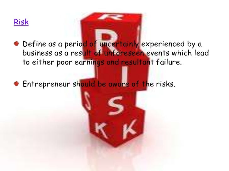 31. 31. Risk Define as a period of uncertainly experienced by a business as a result of unforeseen events which lead to either poor earnings and resultant failure. Entrepreneur should be aware of the risks.