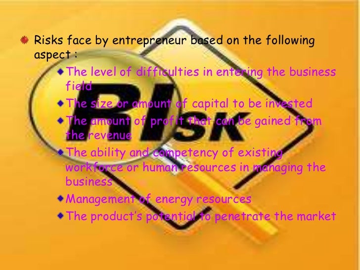 32. 32. Risks face by entrepreneur based on the followingaspect : The level of difficulties in entering the business field The size or amount of capital to be invested The amount of profit that can be gained from the revenue The ability and competency of existing workforce or human resources in managing the business Management of energy resources The product’s potential to penetrate the market