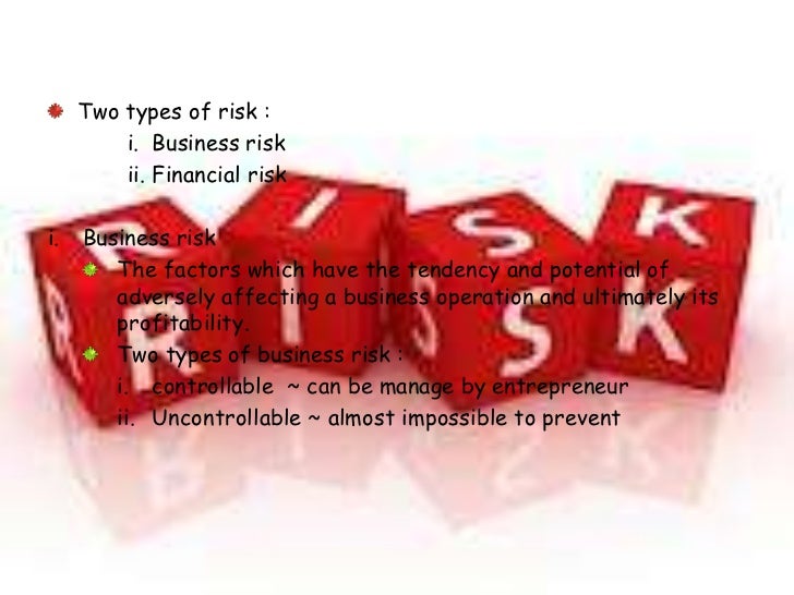 33. 33. Two types of risk : i. Business risk ii. Financial riski. Business risk The factors which have the tendency and potential of adversely affecting a business operation and ultimately its profitability. Two types of business risk : i. controllable ~ can be manage by entrepreneur ii. Uncontrollable ~ almost impossible to prevent