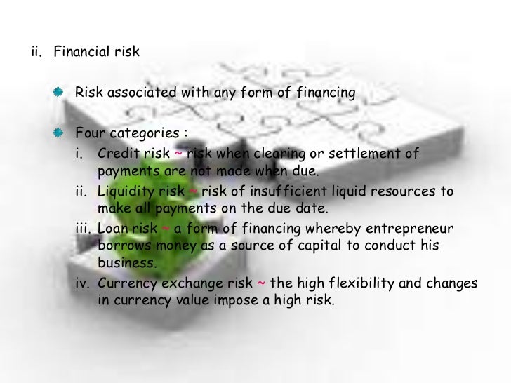 34. 34. ii. Financial risk Risk associated with any form of financing Four categories : i. Credit risk ~ risk when clearing or settlement of payments are not made when due. ii. Liquidity risk ~ risk of insufficient liquid resources to make all payments on the due date. iii. Loan risk ~ a form of financing whereby entrepreneur borrows money as a source of capital to conduct his business. iv. Currency exchange risk ~ the high flexibility and changes in currency value impose a high risk.