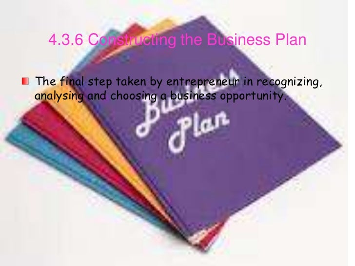 35. 35. 4.3.6 Constructing the Business PlanThe final step taken by entrepreneur in recognizing,analysing and choosing a business opportunity.