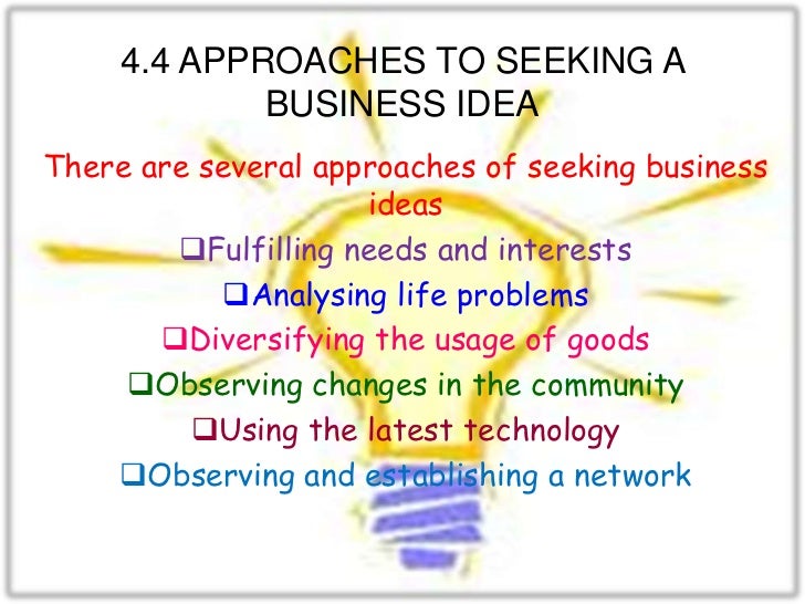 36. 36. 4.4 APPROACHES TO SEEKING A BUSINESS IDEAThere are several approaches of seeking business ideas Fulfilling needs and interests Analysing life problems Diversifying the usage of goods Observing changes in the community Using the latest technology Observing and establishing a network