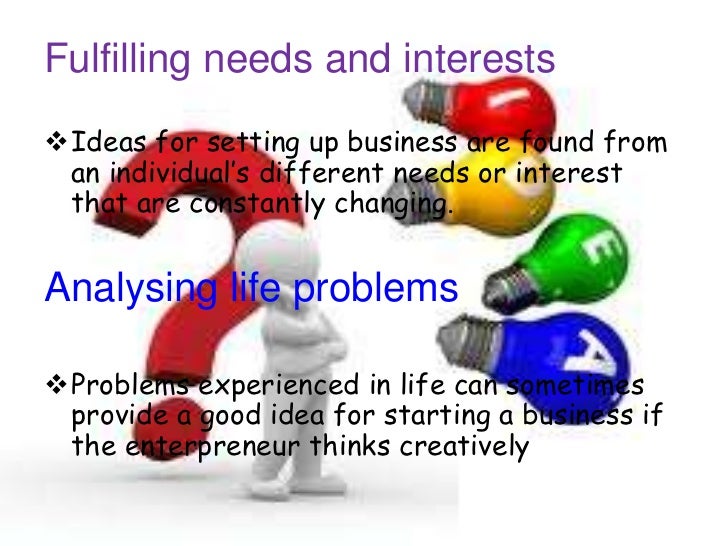 37. 37. Fulfilling needs and interestsIdeas for setting up business are found from an individual’s different needs or interest that are constantly changing.Analysing life problemsProblems experienced in life can sometimes provide a good idea for starting a business if the enterpreneur thinks creatively