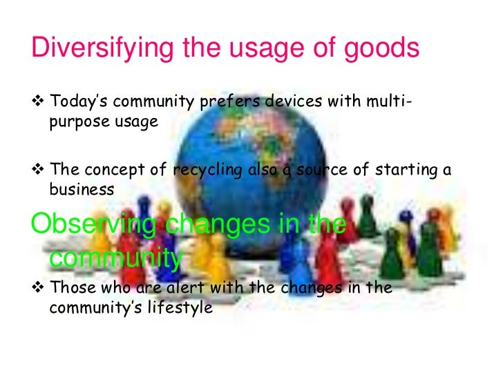 38. 38. Diversifying the usage of goods Today’s community prefers devices with multi- purpose usage The concept of recycling also a source of starting a businessObserving changes in the community Those who are alert with the changes in the community’s lifestyle