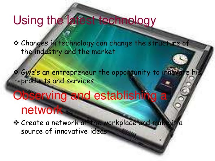 39. 39. Using the latest technology Changes in technology can change the structure of the industry and the market Give’s an entrepreneur the opportunity to innovate his products and servicesObserving and establishing a network Create a network at the workplace and make it a source of innovative ideas