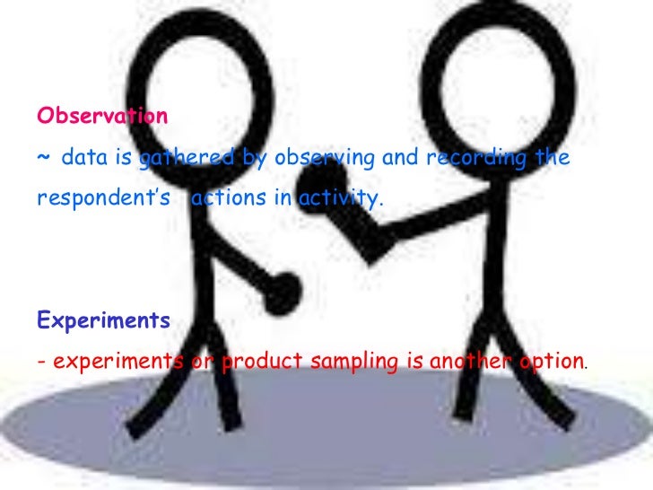 4. 4. Observation~ data is gathered by observing and recording therespondent’s actions in activity.Experiments- experiments or product sampling is another option.