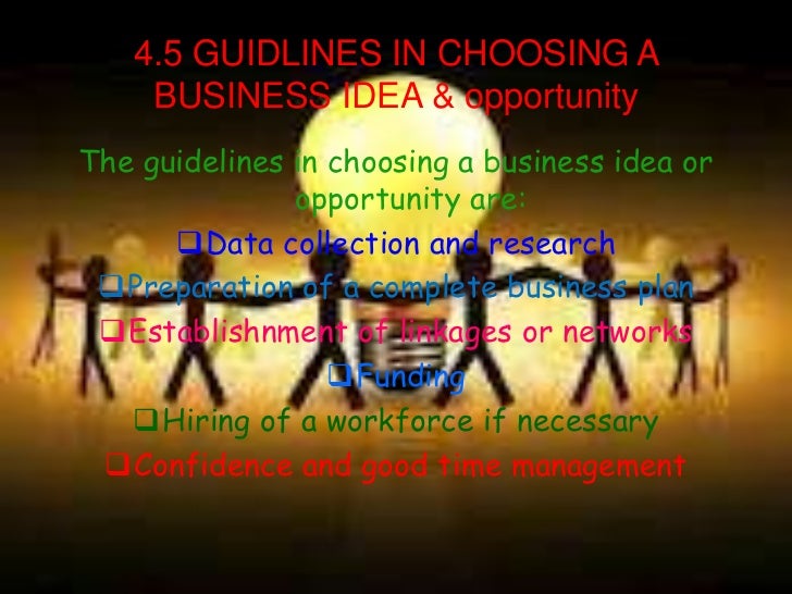 40. 40. 4.5 GUIDLINES IN CHOOSING A BUSINESS IDEA & opportunityThe guidelines in choosing a business idea or opportunity are: Data collection and research Preparation of a complete business plan Establishnment of linkages or networks Funding Hiring of a workforce if necessary Confidence and good time management