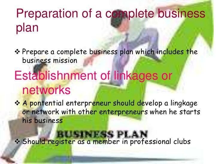 42. 42. Preparation of a complete businessplan Prepare a complete business plan which includes the business missionEstablishnment of linkages or networks A pontential enterpreneur should develop a lingkage or network with other enterpreneurs when he starts his business Should register as a member in professional clubs