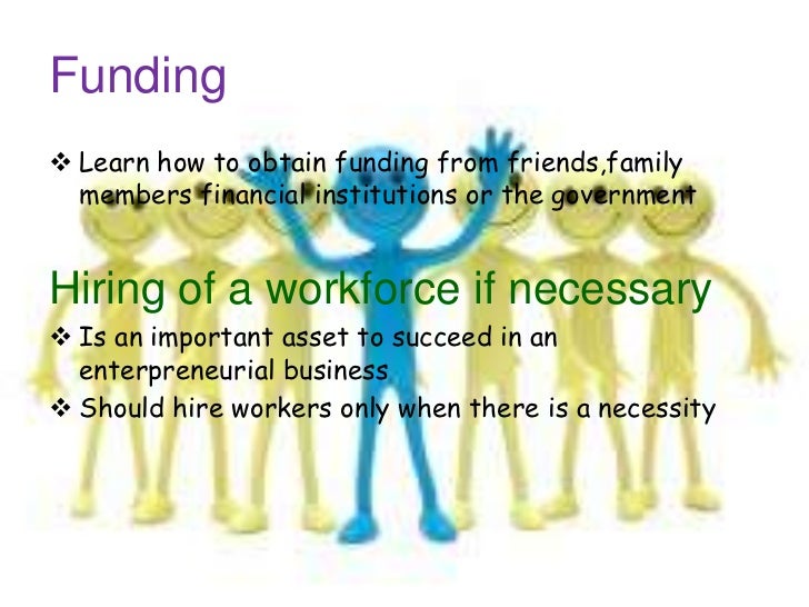 43. 43. Funding Learn how to obtain funding from friends,family members financial institutions or the governmentHiring of a workforce if necessary Is an important asset to succeed in an enterpreneurial business Should hire workers only when there is a necessity