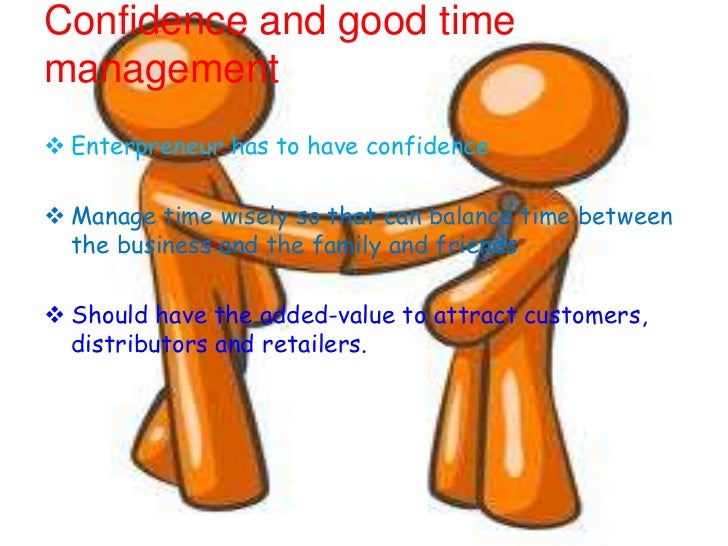 44. 44. Confidence and good timemanagement Enterpreneur has to have confidence Manage time wisely so that can balance time between the business and the family and friends Should have the added-value to attract customers, distributors and retailers.
