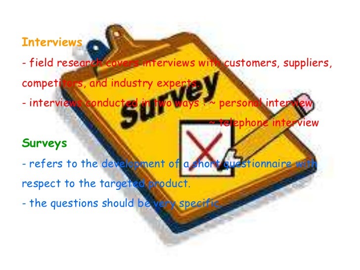 5. 5. Interviews- field research covers interviews with customers, suppliers,competitors, and industry experts.- interviews conducted in two ways : ~ personal interview ~ telephone interviewSurveys- refers to the development of a short questionnaire withrespect to the targeted product.- the questions should be very specific.