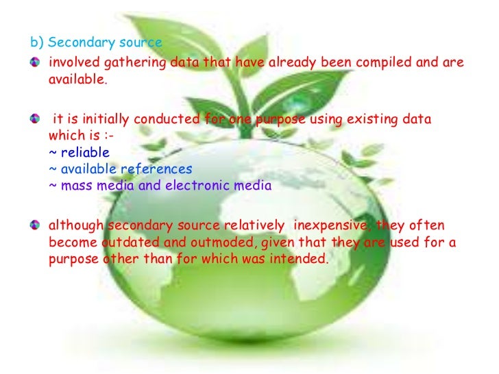 6. 6. b) Secondary source involved gathering data that have already been compiled and are available. it is initially conducted for one purpose using existing data which is :- ~ reliable ~ available references ~ mass media and electronic media although secondary source relatively inexpensive, they often become outdated and outmoded, given that they are used for a purpose other than for which was intended.