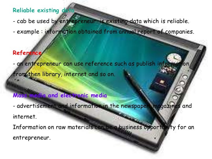 7. 7. Reliable existing data- cab be used by entrepreneur is existing data which is reliable.- example : information obtained from annual report of companies.Reference- an entrepreneur can use reference such as publish informationfrom then library, internet and so on.Mass media and electronic media- advertisement and information in the newspaper, magazines andinternet.Information on raw materials can be a business opportunity for anentrepreneur.