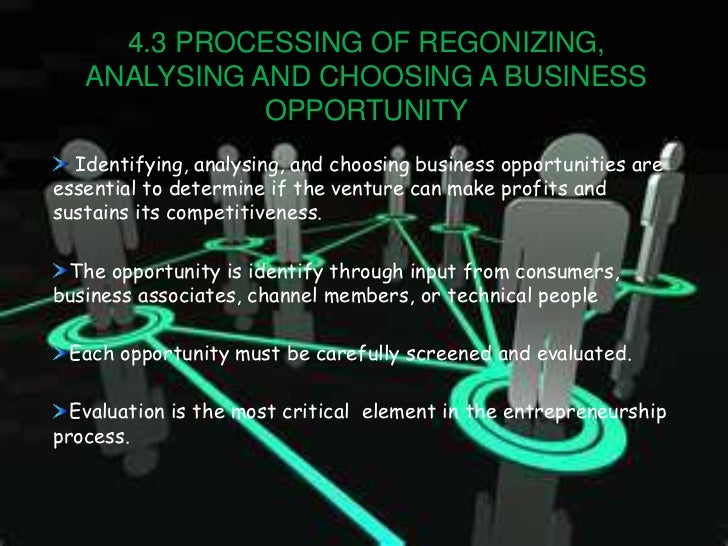 8. 8. 4.3 PROCESSING OF REGONIZING, ANALYSING AND CHOOSING A BUSINESS OPPORTUNITY Identifying, analysing, and choosing business opportunities areessential to determine if the venture can make profits andsustains its competitiveness. The opportunity is identify through input from consumers,business associates, channel members, or technical people Each opportunity must be carefully screened and evaluated. Evaluation is the most critical element in the entrepreneurshipprocess.