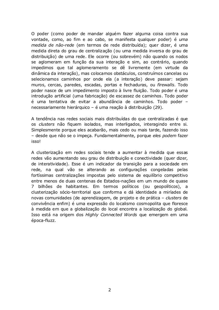 2. 2. O poder (como poder de mandar alguém fazer alguma coisa contra suavontade, como, ao fim e ao cabo, se manifesta qualquer poder) é umamedida de não-rede (em termos de rede distribuída); quer dizer, é umamedida direta do grau de centralização (ou uma medida inversa do grau dedistribuição) de uma rede. Ele ocorre (ou sobrevém) não quando os nodosse aglomeram em função da sua interação e sim, ao contrário, quandoimpedimos que tal aglomeramento se dê livremente (em virtude dadinâmica da interação), mas colocamos obstáculos, construímos cancelas ouselecionamos caminhos por onde ela (a interação) deve passar: sejammuros, cercas, paredes, escadas, portas e fechaduras, ou firewalls. Todopoder nasce de um impedimento imposto à livre fluição. Todo poder é umaintrodução artificial (uma fabricação) de escassez de caminhos. Todo poderé uma tentativa de evitar a abundância de caminhos. Todo poder –necessariamente hierárquico – é uma reação à distribuição (29).A tendência nas redes sociais mais distribuídas do que centralizadas é queos clusters não fiquem isolados, mas interligados, interagindo entre si.Simplesmente porque eles acabarão, mais cedo ou mais tarde, fazendo isso– desde que não se o impeça. Fundamentalmente, porque eles podem fazerisso!A clusterização em redes sociais tende a aumentar à medida que essasredes vão aumentando seu grau de distribuição e conectividade (quer dizer,de interatividade). Esse é um indicador da transição para a sociedade emrede, na qual vão se alterando as configurações congeladas pelasfortíssimas centralizações impostas pelo sistema de equilíbrio competitivoentre menos de duas centenas de Estados-nações em um mundo de quase7 bilhões de habitantes. Em termos políticos (ou geopolíticos), aclusterização sócio-territorial que conforma e dá identidade a miríades denovas comunidades (de aprendizagem, de projeto e de prática – clusters deconvivência enfim) é uma expressão do localismo cosmopolita que floresceà medida em que a globalização do local encontra a localização do global.Isso está na origem dos Highly Connected Words que emergem em umaépoca-fluzz. 2