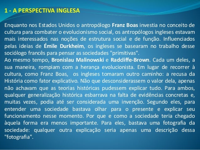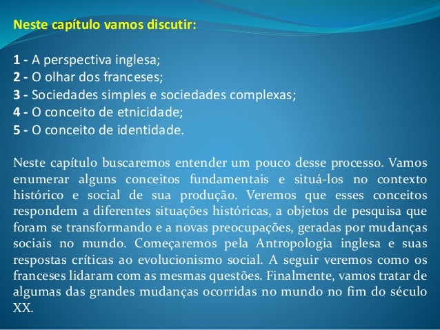 Neste capítulo buscaremos entender um pouco desse processo. Vamos enumerar alguns conceitos fundamentais e situá-los no contexto histórico e social de sua produção. Veremos que esses conceitos respondem a diferentes situações históricas, a objetos de pesquisa que foram se transformando e a novas preocupações, geradas por mudanças sociais no mundo. Começaremos pela Antropologia inglesa e suas respostas críticas ao evolucionismo social. A seguir veremos como os franceses lidaram com as mesmas questões. Finalmente, vamos tratar de algumas das grandes mudanças ocorridas no mundo no fim do século XX.
