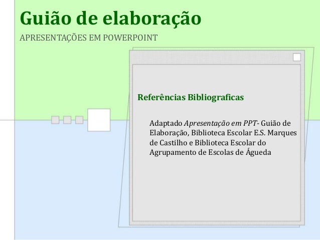 10. 10. Guião de elaboração APRESENTAÇÕES EM POWERPOINT Referências Bibliograficas Adaptado Apresentação em PPT- Guião de Elaboração, Biblioteca Escolar E.S. Marques de Castilho e Biblioteca Escolar do Agrupamento de Escolas de Águeda