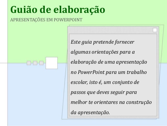 2. 2. Este guia pretende fornecer algumas orientações para a elaboração de uma apresentação no PowerPoint para um trabalho escolar, isto é, um conjunto de passos que deves seguir para melhor te orientares na construção da apresentação. Guião de elaboração APRESENTAÇÕES EM POWERPOINT