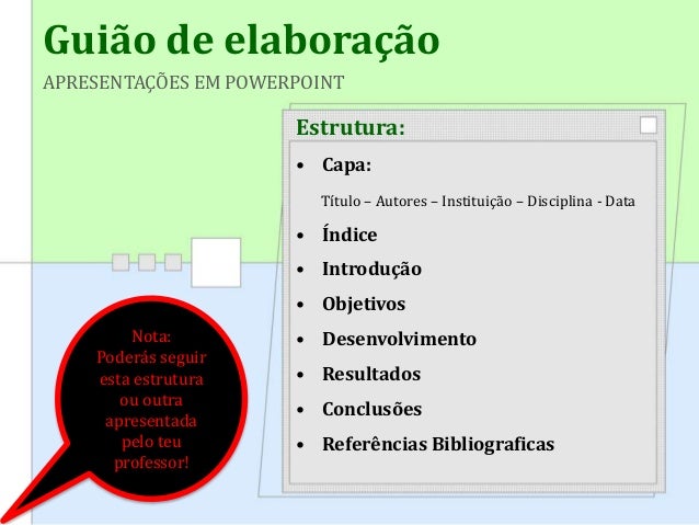 5. 5. Guião de elaboração APRESENTAÇÕES EM POWERPOINT Estrutura: • Capa: Título – Autores – Instituição – Disciplina - Data • Índice • Introdução • Objetivos • Desenvolvimento • Resultados • Conclusões • Referências Bibliograficas Nota: Poderás seguir esta estrutura ou outra apresentada pelo teu professor!