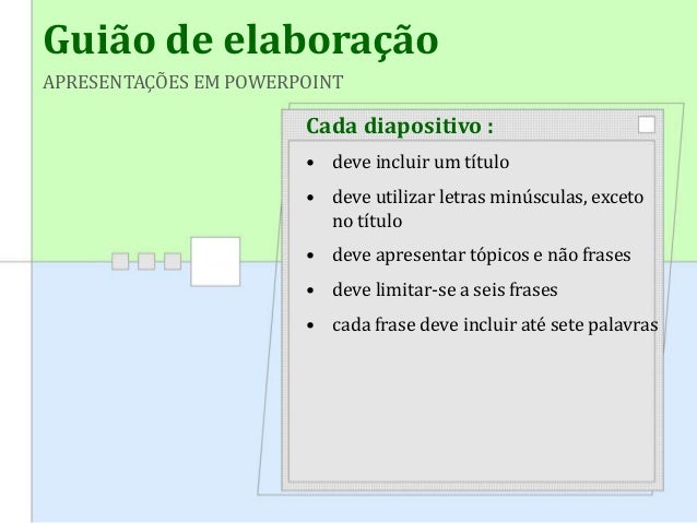 6. 6. Guião de elaboração APRESENTAÇÕES EM POWERPOINT Cada diapositivo : • deve incluir um título • deve utilizar letras minúsculas, exceto no título • deve apresentar tópicos e não frases • deve limitar-se a seis frases • cada frase deve incluir até sete palavras