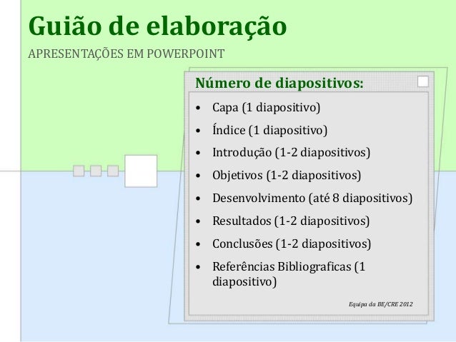 7. 7. Guião de elaboração APRESENTAÇÕES EM POWERPOINT Número de diapositivos: • Capa (1 diapositivo) • Índice (1 diapositivo) • Introdução (1-2 diapositivos) • Objetivos (1-2 diapositivos) • Desenvolvimento (até 8 diapositivos) • Resultados (1-2 diapositivos) • Conclusões (1-2 diapositivos) • Referências Bibliograficas (1 diapositivo) Equipa da BE/CRE 2012