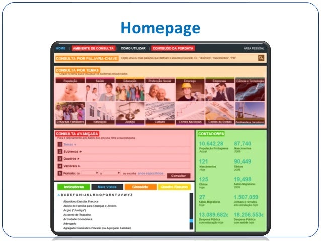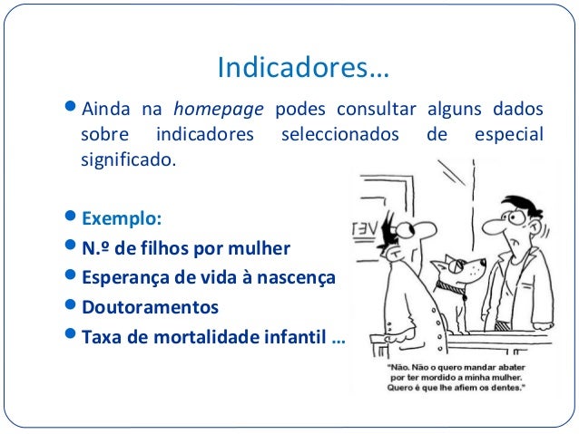 9. 9. Indicadores… Ainda na homepage podes consultar alguns dados sobre indicadores seleccionados de especial significado. Exemplo: N.º de filhos por mulher Esperança de vida à nascença Doutoramentos Taxa de mortalidade infantil …