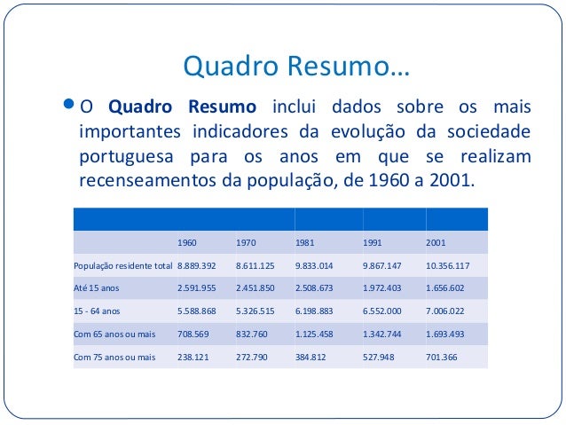 10. 10. Quadro Resumo… O Quadro Resumo inclui dados sobre os mais importantes indicadores da evolução da sociedade portuguesa para os anos em que se realizam recenseamentos da população, de 1960 a 2001. 1960 1970 1981 1991 2001 População residente total 8.889.392 8.611.125 9.833.014 9.867.147 10.356.117 Até 15 anos 2.591.955 2.451.850 2.508.673 1.972.403 1.656.602 15 - 64 anos 5.588.868 5.326.515 6.198.883 6.552.000 7.006.022 Com 65 anos ou mais 708.569 832.760 1.125.458 1.342.744 1.693.493 Com 75 anos ou mais 238.121 272.790 384.812 527.948 701.366