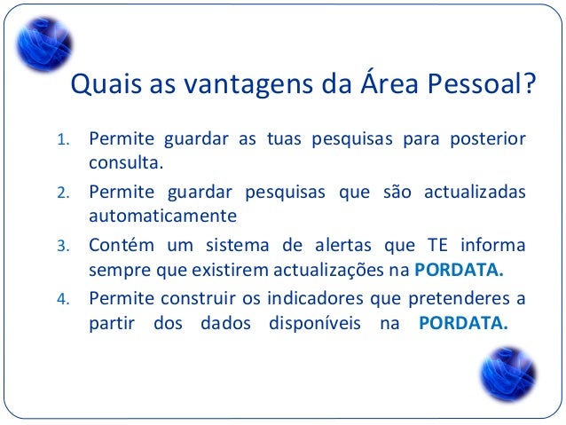 13. 13. Quais as vantagens da Área Pessoal? 1. Permite guardar as tuas pesquisas para posterior consulta. 2. Permite guardar pesquisas que são actualizadas automaticamente 3. Contém um sistema de alertas que TE informa sempre que existirem actualizações na PORDATA. 4. Permite construir os indicadores que pretenderes a partir dos dados disponíveis na PORDATA.