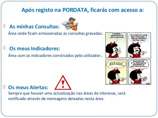 14. 14. Após registo na PORDATA, ficarás com acesso a:  As minhas Consultas: Área onde ficam armazenadas as consultas gravadas.  Os meus Indicadores: Área com os indicadores construídos pelo utilizador.  Os meus Alertas: Sempre que houver uma actualização nas áreas de interesse, será notificado através de mensagens deixadas nesta área.