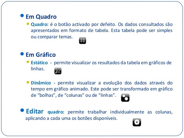 17. 17. Em Quadro Quadro: é o botão activado por defeito. Os dados consultados são apresentados em formato de tabela. Esta tabela pode ser simples ou comparar temas. Em Gráfico Estático - permite visualizar os resultados da tabela em gráficos de linhas. Dinâmico - permite visualizar a evolução dos dados através do tempo em gráfico animado. Este pode ser transformado em gráfico de “bolhas”, de “colunas” ou de “linhas”. Editar quadro: permite trabalhar individualmente as colunas, aplicando a cada uma os botões disponíveis.
