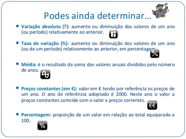 18. 18. Podes ainda determinar…  Variação absoluta (?): aumento ou diminuição dos valores de um ano (ou período) relativamente ao anterior.  Taxa de variação (%): aumento ou diminuição dos valores de um ano (ou de um período) relativamente ao anterior, em percentagem.  Média: é o resultado da soma dos valores anuais divididos pelo número de anos.  Preços constantes (em €): valor em € tendo por referência os preços de um ano. O ano de referência adoptado é 2000. Neste ano o valor a preços constantes coincide com o valor a preços correntes.  Percentagem: proporção de um valor em relação ao total equiparado a 100.
