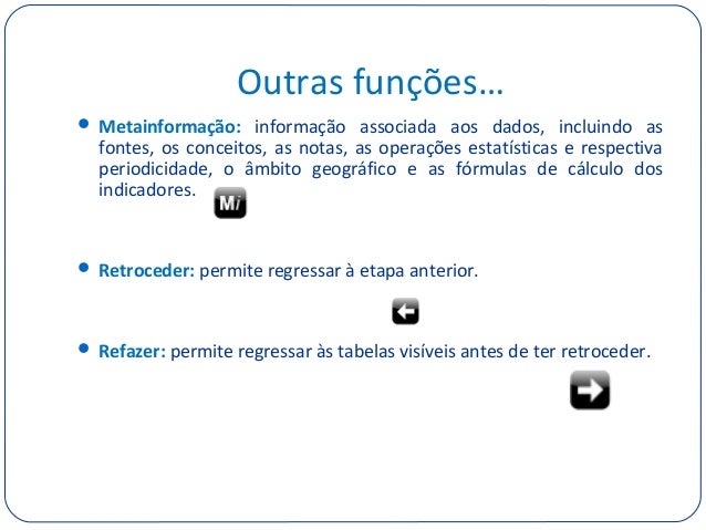19. 19. Outras funções…  Metainformação: informação associada aos dados, incluindo as fontes, os conceitos, as notas, as operações estatísticas e respectiva periodicidade, o âmbito geográfico e as fórmulas de cálculo dos indicadores.  Retroceder: permite regressar à etapa anterior.  Refazer: permite regressar às tabelas visíveis antes de ter retroceder.