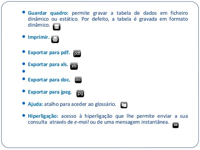 21. 21.  Guardar quadro: permite gravar a tabela de dados em ficheiro dinâmico ou estático. Por defeito, a tabela é gravada em formato dinâmico.  Imprimir.  Exportar para pdf.  Exportar para xls.   Exportar para doc.  Exportar para jpeg.  Ajuda: atalho para aceder ao glossário.  Hiperligação: acesso à hiperligação que lhe permite enviar a sua consulta através de e-mail ou de uma mensagem instantânea.