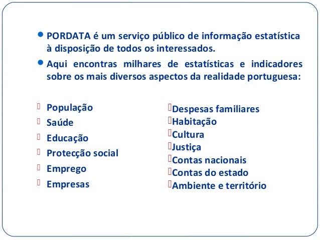 3. 3. PORDATA é um serviço público de informação estatística à disposição de todos os interessados. Aqui encontras milhares de estatísticas e indicadores sobre os mais diversos aspectos da realidade portuguesa:  População  Saúde  Educação  Protecção social  Emprego  Empresas Despesas familiares Habitação Cultura Justiça Contas nacionais Contas do estado Ambiente e território