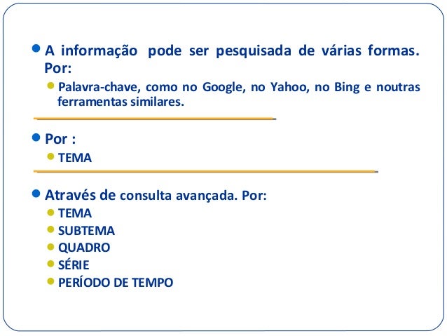 6. 6. A informação pode ser pesquisada de várias formas. Por: Palavra-chave, como no Google, no Yahoo, no Bing e noutras ferramentas similares. Por : TEMA Através de consulta avançada. Por: TEMA SUBTEMA QUADRO SÉRIE PERÍODO DE TEMPO