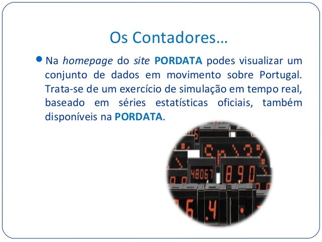8. 8. Os Contadores… Na homepage do site PORDATA podes visualizar um conjunto de dados em movimento sobre Portugal. Trata-se de um exercício de simulação em tempo real, baseado em séries estatísticas oficiais, também disponíveis na PORDATA.