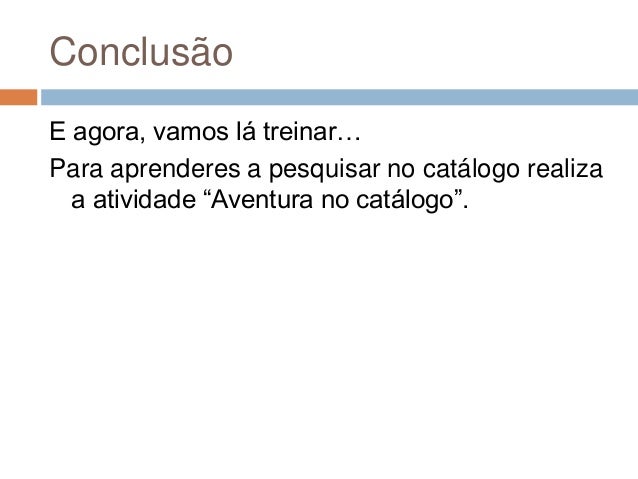 18. 18. ConclusãoE agora, vamos lá treinar…Para aprenderes a pesquisar no catálogo realizaa atividade “Aventura no catálogo”.