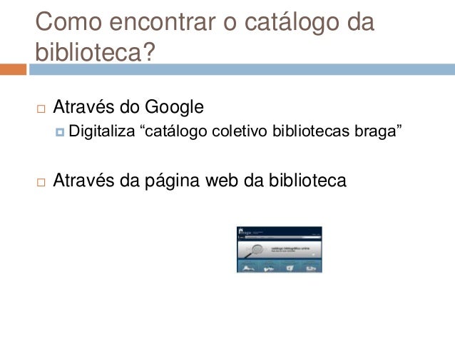 2. 2. Como encontrar o catálogo dabiblioteca? Através do Google Digitaliza “catálogo coletivo bibliotecas braga” Através da página web da biblioteca