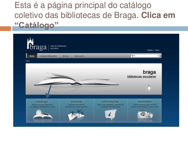 5. 5. Esta é a página principal do catálogocoletivo das bibliotecas de Braga. Clica em“Catálogo”