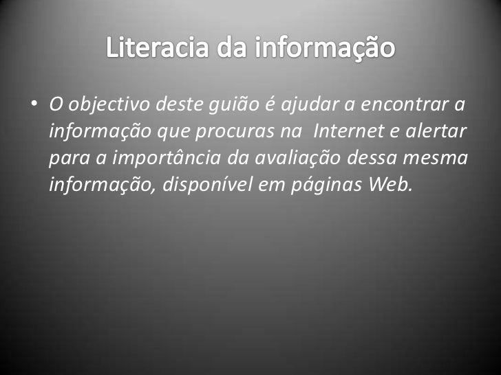2. 2. Literacia da informação<br />O objectivo deste guião é ajudar a encontrar a informação que procuras na Internet e alertar para a importância da avaliação dessa mesma informação, disponível em páginas Web.<br />