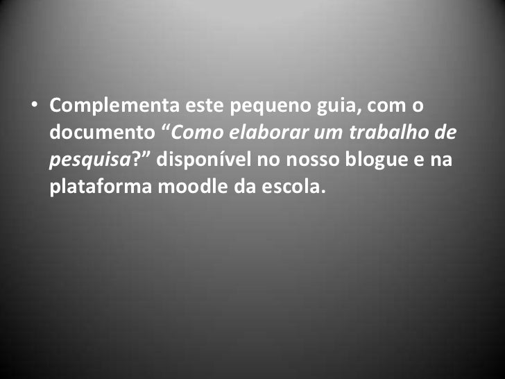 3. 3. Complementa este pequeno guia, com o documento “Comoelaborar um trabalho de pesquisa?” disponível no nosso blogue e na plataforma moodle da escola.<br />