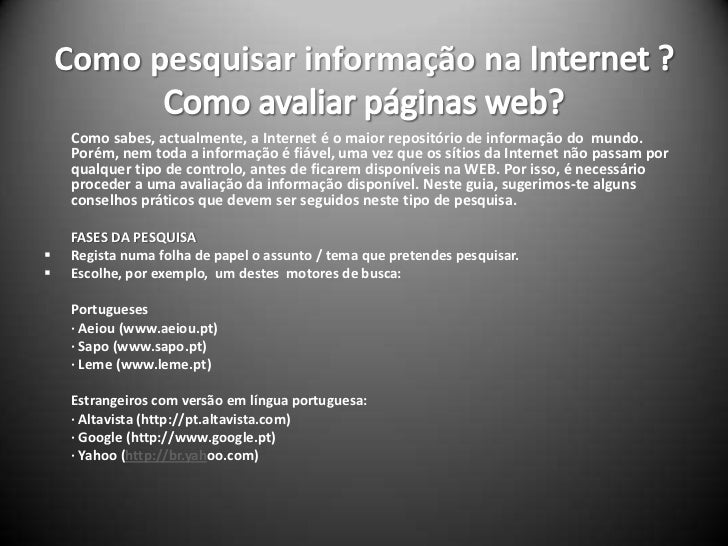 4. 4. Como pesquisar informação na Internet ?Como avaliar páginas web?<br />Como sabes, actualmente, a Internet é o maior repositório de informação do mundo. Porém, nem toda a informação é fiável, uma vez que os sítios da Internet não passam por qualquer tipo de controlo, antes de ficarem disponíveis na WEB. Por isso, é necessário proceder a uma avaliação da informação disponível. Neste guia, sugerimos-te alguns conselhos práticos que devem ser seguidos neste tipo de pesquisa.<br />FASES DA PESQUISA<br /><ul><li>Regista numa folha de papel o assunto / tema que pretendes pesquisar.