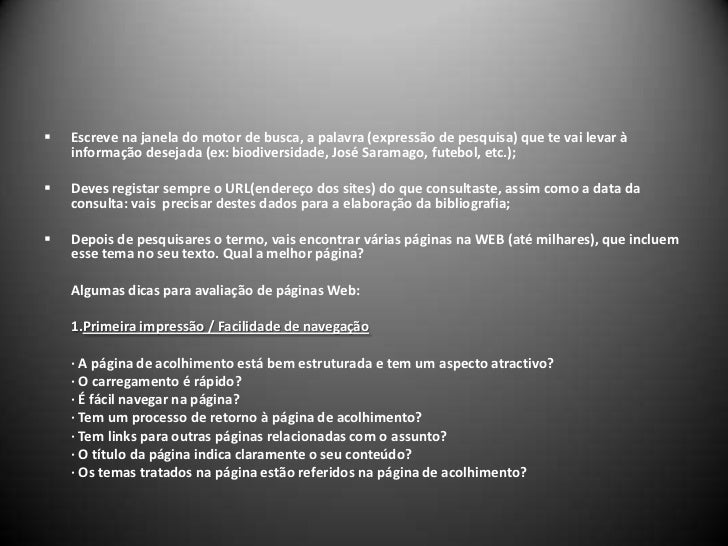 6. 6. <ul><li>Escreve na janela do motor de busca, a palavra (expressão de pesquisa) que te vai levar à informação desejada (ex: biodiversidade, José Saramago, futebol, etc.);</li></ul> <br /><ul><li>Deves registar sempre o URL(endereço dos sites) do que consultaste, assim como a data da consulta: vais precisar destes dados para a elaboração da bibliografia;</li></ul> <br /><ul><li>Depois de pesquisares o termo, vais encontrar várias páginas na WEB (até milhares), que incluem esse tema no seu texto. Qual a melhor página? </li></ul> Algumas dicas para avaliação de páginas Web:<br />1.Primeira impressão / Facilidade de navegação<br /> <br /> · A página de acolhimento está bem estruturada e tem um aspecto atractivo?<br /> · O carregamento é rápido?<br /> · É fácil navegar na página?<br /> · Tem um processo de retorno à página de acolhimento?<br /> · Tem links para outras páginas relacionadas com o assunto?<br /> · O título da página indica claramente o seu conteúdo?<br /> · Os temas tratados na página estão referidos na página de acolhimento? <br />