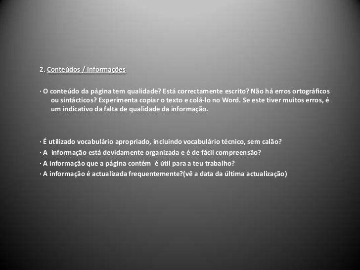 7. 7. 2. Conteúdos / Informações<br />· O conteúdo da página tem qualidade? Está correctamente escrito? Não há erros ortográficos ou sintácticos? Experimenta copiar o texto e colá-lo no Word. Se este tiver muitos erros, é um indicativo da falta de qualidade da informação.<br /> <br /> <br />· É utilizado vocabulário apropriado, incluindo vocabulário técnico, sem calão?<br />· A informação está devidamente organizada e é de fácil compreensão?<br />· A informação que a página contém é útil para a teu trabalho?<br />· A informação é actualizada frequentemente?(vê a data da última actualização)<br /> <br />