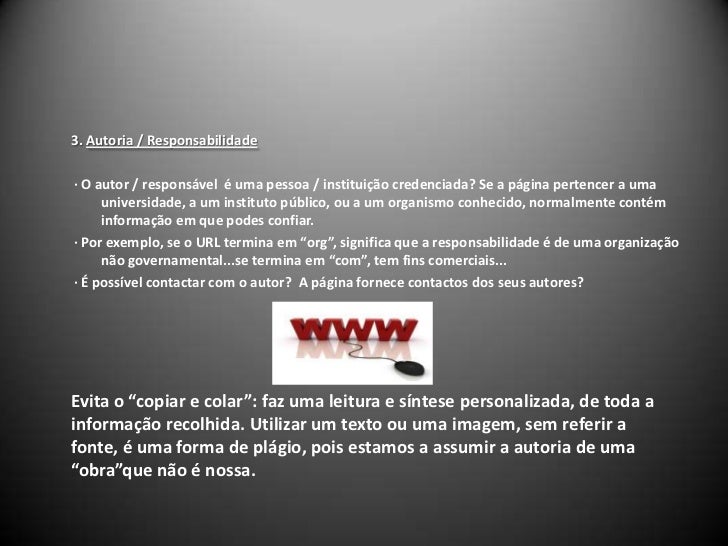 8. 8. 3. Autoria / Responsabilidade<br />· O autor / responsável é uma pessoa / instituição credenciada? Se a página pertencer a uma universidade, a um instituto público, ou a um organismo conhecido, normalmente contém informação em que podes confiar.<br />· Por exemplo, se o URL termina em “org”, significa que a responsabilidade é de uma organização não governamental...se termina em “com”, tem fins comerciais...<br />· É possível contactar com o autor? A página fornece contactos dos seus autores?<br /> <br /> Evita o “copiar e colar”: faz uma leitura e síntese personalizada, de toda a informação recolhida. Utilizar um texto ou uma imagem, sem referir a fonte, é uma forma de plágio, pois estamos a assumir a autoria de uma “obra”que não é nossa. <br />