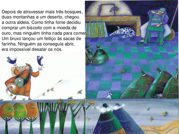 9. 9. Depois de atravessar mais três bosques,duas montanhas e um deserto, chegoua outra aldeia. Como tinha fome decidiucomprar um biscoito com a moeda deouro, mas ninguém tinha nada para comer.Um bruxo lançou um feitiço às sacas defarinha. Ninguém as conseguia abrir,era impossível desatar os nós.
