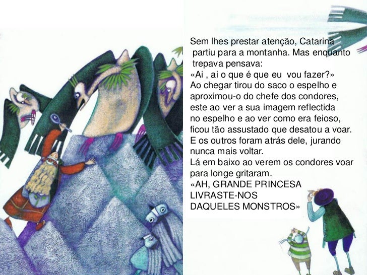 14. 14. Sem lhes prestar atenção, Catarina partiu para a montanha. Mas enquanto trepava pensava:«Ai , ai o que é que eu vou fazer?»Ao chegar tirou do saco o espelho eaproximou-o do chefe dos condores,este ao ver a sua imagem reflectidano espelho e ao ver como era feioso,ficou tão assustado que desatou a voar.E os outros foram atrás dele, jurandonunca mais voltar.Lá em baixo ao verem os condores voarpara longe gritaram.«AH, GRANDE PRINCESALIVRASTE-NOSDAQUELES MONSTROS»